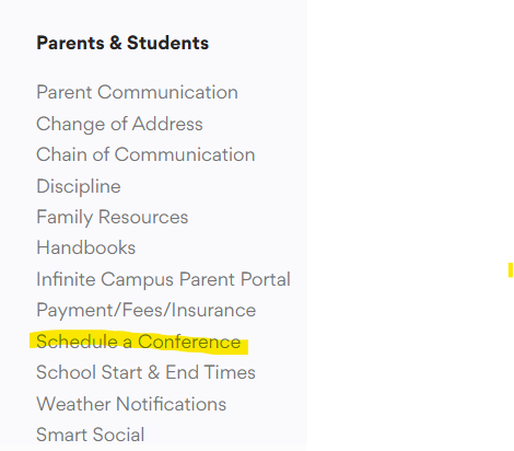 The link to the Conference Scheduler is on the District Website- Menu- Parents & Students.